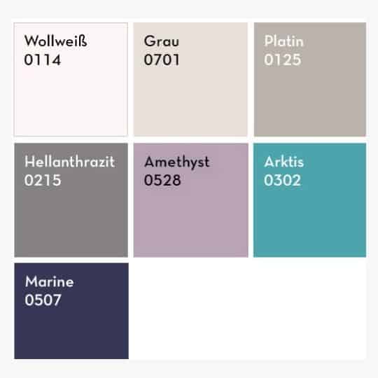 Amethyst 0528, Arctic blue 0302, Grey 0701, Light anthracite 0215, Navy 0507, Off-white 0114, Platinum 0125